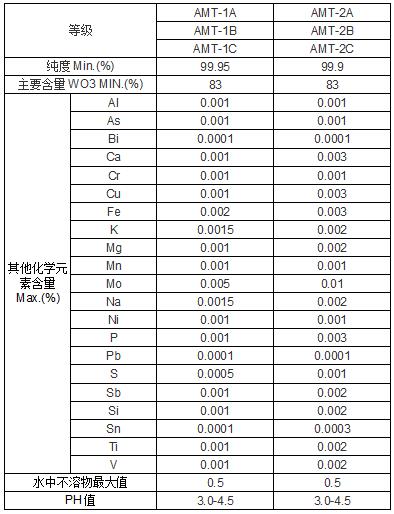 性質(zhì):偏鎢酸銨水溶性的白色結(jié)晶粉末或微黃色。300g/100ml。偏鎢酸銨溶于水,仲鎢酸銨不易溶于水,這是偏鎢酸銨和仲鎢酸銨明顯的區(qū)別之處。
